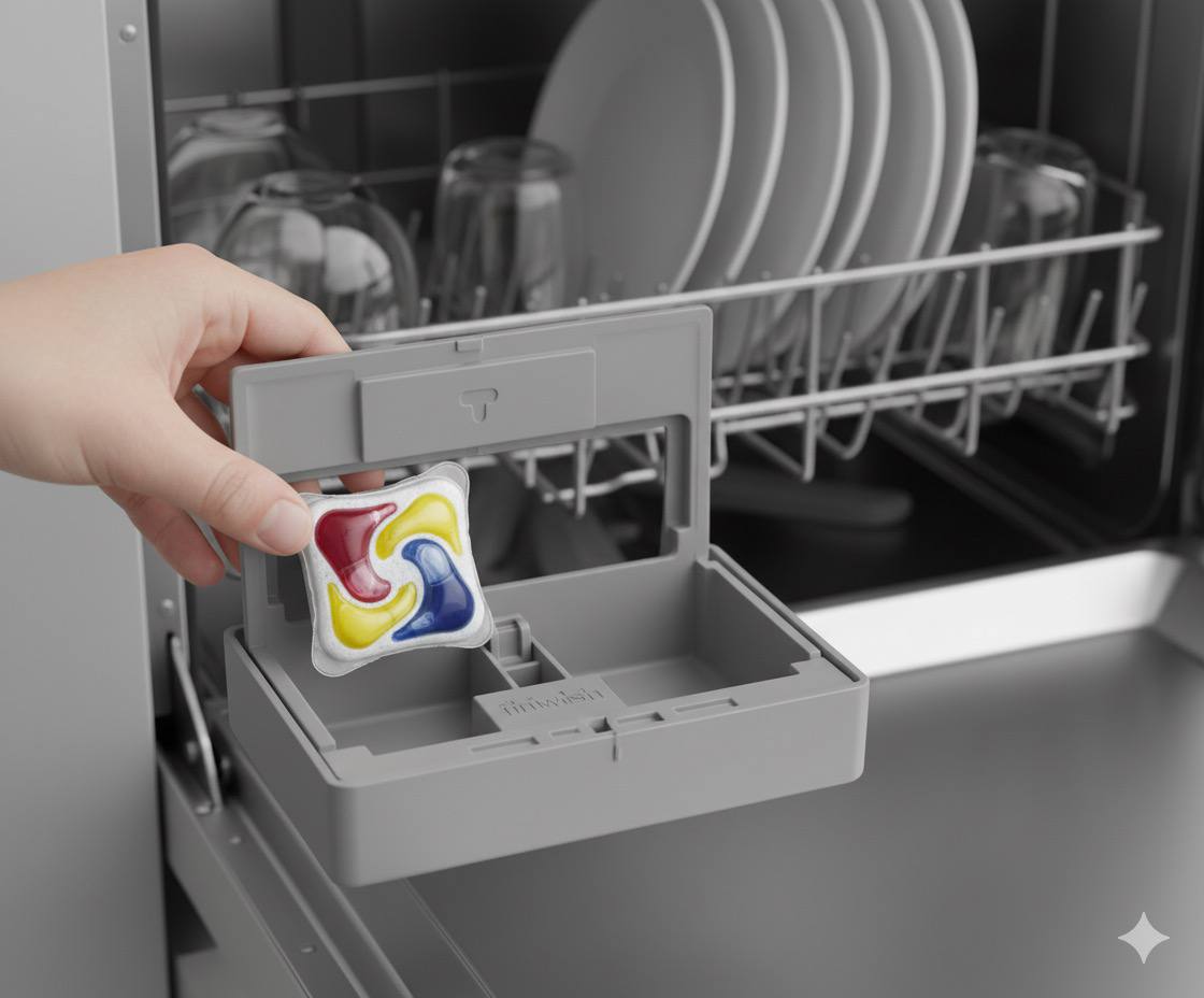 2. قرار دادن در محفظه: قرص را به صورت مستقیم و با دست‌های خشک، در محفظه مخصوص شوینده ماشین ظرفشویی قرار دهید.